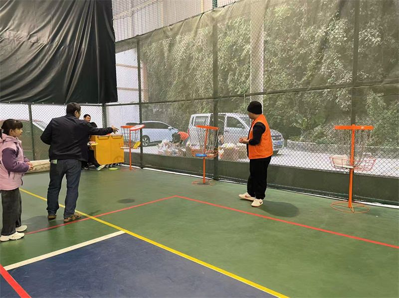 本次游园活动的最大亮点,在于项目设计深度融合柳州体育特色,将飞盘高尔夫、射箭、旱地冰壶、投篮等新兴体育项目与传统游园趣味相结合,让职工在娱乐中感受体育魅力,在互动中推广新兴项目。飞盘高尔夫场地内,大家站在分界线外凝神投掷,每一次飞盘精准落入道具都引来阵阵喝彩;射箭区域里,选手们屏息凝神、拉弓瞄准,在击中靶盘圆孔的瞬间收获满满的成就感;旱地冰壶项目则考验着参与者的策略与手感,滑动的冰壶承载着欢声笑语在靶区穿梭;趣味蹴鞠、快乐投篮、沙包投福等项目同样人气高涨,连续颠球的娴熟、瑜伽球入筐的精准、沙包击靶的专注,无不展现着柳州体育人的运动素养。而击鼓纳福的蒙眼挑战与趣味套圈的惊喜互动,更让现场氛围持续升温,无论是经验丰富的老职工,还是活力满满的年轻运动员,都在一个个项目中重拾童真、收获快乐。